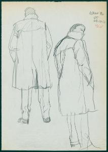 Bozzetto per il periodico dei grandi magazzini la Rinascente "Uomo la Rinascente Moda maschile" dell'ottobre 1961. figure maschili di spalle con soprabito