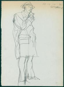 Bozzetto per il periodico dei grandi magazzini la Rinascente "Uomo la Rinascente Moda maschile" dell'ottobre 1961. figura maschile con soprabito e cappello