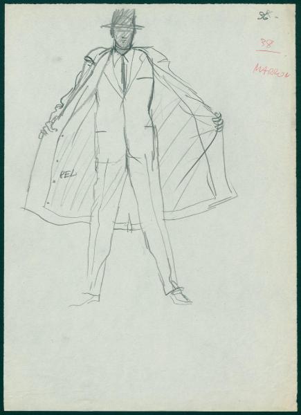 Bozzetto per il periodico dei grandi magazzini la Rinascente "Uomo la Rinascente Moda maschile" dell'ottobre 1961. figura maschile con completo, soprabito e cappello