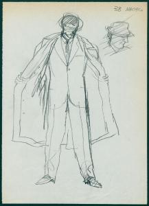 Bozzetto per il periodico dei grandi magazzini la Rinascente "Uomo la Rinascente Moda maschile" dell'ottobre 1961. figura maschile con completo, soprabito e cappello