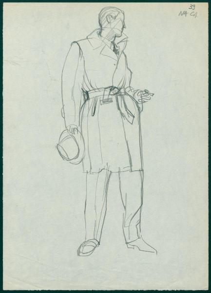 Bozzetto per il periodico dei grandi magazzini la Rinascente "Uomo la Rinascente Moda maschile" dell'ottobre 1961. figura maschile con soprabito e cappello in mano