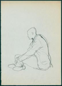 Bozzetto per il periodico dei grandi magazzini la Rinascente "Uomo la Rinascente Moda maschile" dell'ottobre 1961. figura maschile di profilo seduta per terra