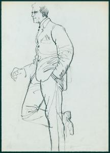 Bozzetto per il periodico dei grandi magazzini la Rinascente "Uomo la Rinascente Moda maschile" dell'ottobre 1961. uomo di profilo con gamba piegata con completo