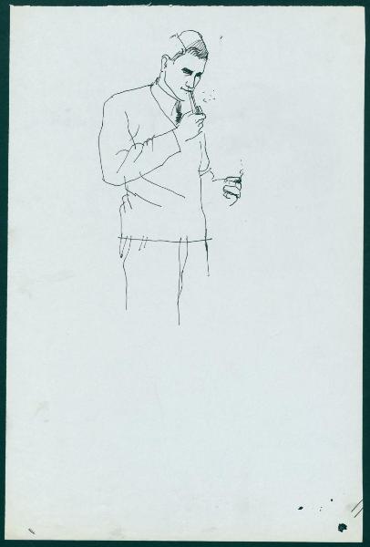 Bozzetto per il periodico dei grandi magazzini la Rinascente "Uomo la Rinascente Moda maschile" dell'ottobre 1961. uomo con maglione con scollo a v e pipa