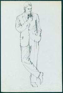 Bozzetto per il periodico dei grandi magazzini la Rinascente "Uomo la Rinascente Moda maschile" dell'ottobre 1961. uomo con completo con giacca monopetto e pipa
