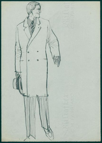 Bozzetto per il periodico dei grandi magazzini la Rinascente "Uomo la Rinascente Moda maschile" dell'ottobre 1961. uomo con soprabito monopetto e cappello in mano