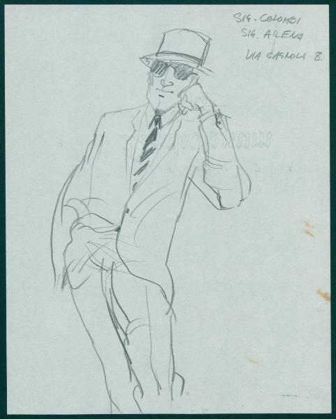 Bozzetto per il periodico dei grandi magazzini la Rinascente "Uomo la Rinascente Moda maschile" dell'ottobre 1961. figura maschile con completo, cappello e occhiali da sole