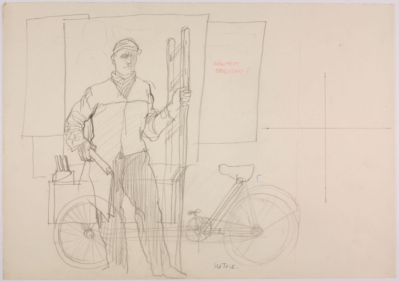 Bozzetto per il catalogo della campagna pubblicitaria del marchio di abbigliamento Facis, stagione primavera-estate 1962. attacchino con bicicletta e scala davanti a manifesti