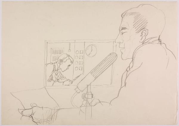 Bozzetto per il catalogo della campagna pubblicitaria del marchio di abbigliamento Facis, stagione primavera-estate 1962. conduttore radiofonico e tecnico in studio
