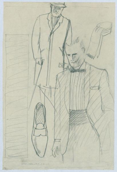 Bozzetto per il periodico dei grandi magazzini la Rinascente "Uomo la Rinascente Moda maschile" dell'ottobre 1962. uomo con soprabito, uomo con smoking