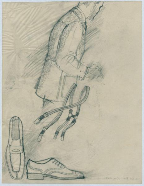 Bozzetto per il periodico dei grandi magazzini la Rinascente "Uomo la Rinascente Moda maschile" dell'ottobre 1962. uomo di profilo con completo e dettagli di scarpe e bretelle