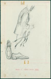 Bozzetto per il periodico dei grandi magazzini la Rinascente "Uomo la Rinascente Moda maschile" dell'ottobre 1962. uomo di profilo con completo, scarpe, bretelle