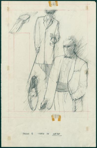 Bozzetto per il periodico dei grandi magazzini la Rinascente "Uomo la Rinascente Moda maschile" dell'ottobre 1962. uomo con soprabito, uomo con smoking