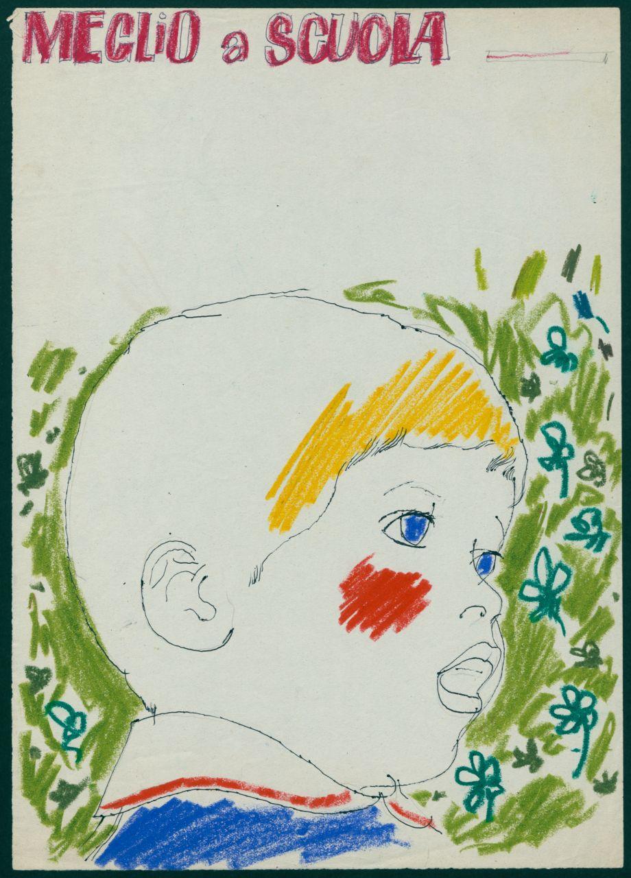 Bozzetto per il manifesto del reparto Scuola dei grandi magazzini la Rinascente. iscrizioni, volto di bambino