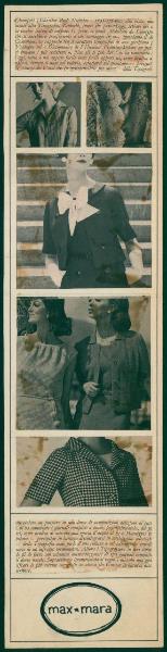 Layout di annuncio pubblicitario per la casa di moda Max Mara. iscrizioni, donne con tailleurs