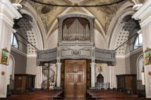 - NOTIZIE STORICO CRITICHE La cassa d’organo della Chiesa di S. Pietro a Cataeggio di Val Masino è realizzata nello stesso stile della cantoria e venne costruita nel 1866, in occasione della installazione dell’organo. Si tratta di un’opera in legno d'abete dipinto in grigio e decorato con applicazioni lignee che ne ingentiliscono l’aspetto. La struttura è ad arco ribassato, inquadrato superiormente e inferiormente da sobrie modanature. I bordi laterali della facciata sono ornati con motivi volutiformi e agli angoli supero-anteriori sono applicate due testine alate di cherubino in legno. Le canne di facciata sono disposte a tricuspide, con cuspide centrale maggiore, in un’unica campata.\n