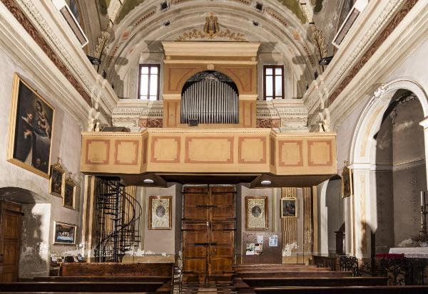 - NOTIZIE STORICO CRITICHE La cassa d'organo della Chiesa di S. Martino in Val Masino è coordinata alla sua tribuna. Stilisticamente riferibile all'ultimo quarto del XIX secolo, è realizzata in legno d'abete intagliato, sagomato e dipinto. Le canne sono disposte ad arco in un'unica campata. Il manufatto è abbellito da due modanature laterali con cornice a dentelli, tinte in bianco, che suddividono la cassa in una parte superiore e una inferiore, riquadrate con specchiature sagomate ed evidenziate da una tinta più scura di quella di base. Il coronamento superiore è costituito da una cornice modanata in colore bianco e risulta ingentilito da tre applicazioni lignee di tipo floreale in bianco.