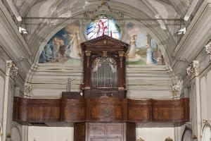 - NOTIZIE STORICO CRITICHE La cassa d'organo della Chiesa di S. Lorenzo a Fusine venne realizzata in occasione dell'installazione dell'organo, che la comunità acquistò nel 1781 dall'organaro bresciano Giuseppe Antonio Cadei. Fu costruita dall'intagliatore Tomaso Petroboni da Vione in Val Camonica, il quale venne retribuito a dicembre 1794, anche per aver effettuato l'accrescimento della tribuna. Si tratta di un manufatto di stile neoclassico, fabbricato in legno di noce intagliato, decorato con applicazioni lignee e parzialmente dorato. La facciata è a campata unica con canne disposte a cuspide con ali laterali. Termina ad arco con finta chiave di volta lignea dorata da cui pende un intaglio, a forma di ghirlanda fogliacea, che si raccorda ai due lati interni della campata. Quattro finte colonne con capitelli corinzi (due laterali e due in facciata di fianco alla campata) sostengono idealmente un frontone parzialmente dorato e riccamente modanato, ornato di applicazioni lignee intagliate. Il timpano è abbellito da un fiore centrale, compreso tra due girali fogliacei.\n\n