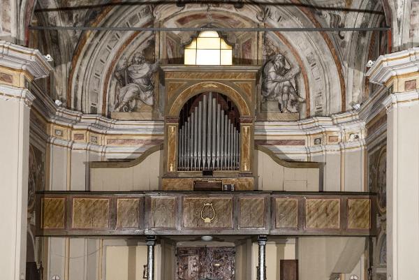 Cassa d'organo con semplici modanature e fregi dipinti in oro e finto marmo