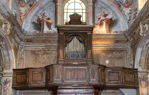 - NOTIZIE STORICO CRITICHE La cassa d'organo del Santuario della Beata Vergine della Neve e di S. Carlo in Chiuro venne realizzata nel 1804, in concomitanza con l'installazione di un nuovo organo. È costruita in stile neoclassico con legno di larice sagomato, modanato, intagliato, dipinto e dorato con foglia d'oro, sebbene quest'ultima sia stata mascherata da strati di vernice color oro. Le canne di facciata sono disposte a cuspide in un'unica campata e ornate in sommità da un festone floreale, realizzato in legno sagomato e intagliato, ornato di foglie e fiori dipinti. Ai lati della campata sono presenti due lesene modellate a colonna a fusto scanalato con capitello ionico. L'architrave è modanato e arricchito di una cornice intagliata a dentelli e di una dipinta a rais de coeur. Vi è iscritta in nero la data di fabbricazione in numeri romani: MDCCCIV. Il fastigio superiore, a profilo mistilineo, è evidenziato da un bordo color oro e sormontato da un fregio fogliaceo, dipinto in oro e verde. Al centro del fastigio si legge un'esortazione tratta da un sermone di Bernardo da Chiaravalle: SI INSURGANT VENTI / TENTATIONUM / SI INCURRAS SCOPULOS / TRIBULATIONUM / RESPICE STELLAM / VOCA MARIAM. L'iscrizione è stata ritoccata e, anziché TRIBULATIONUM, si legge TRIBULANTIUM.