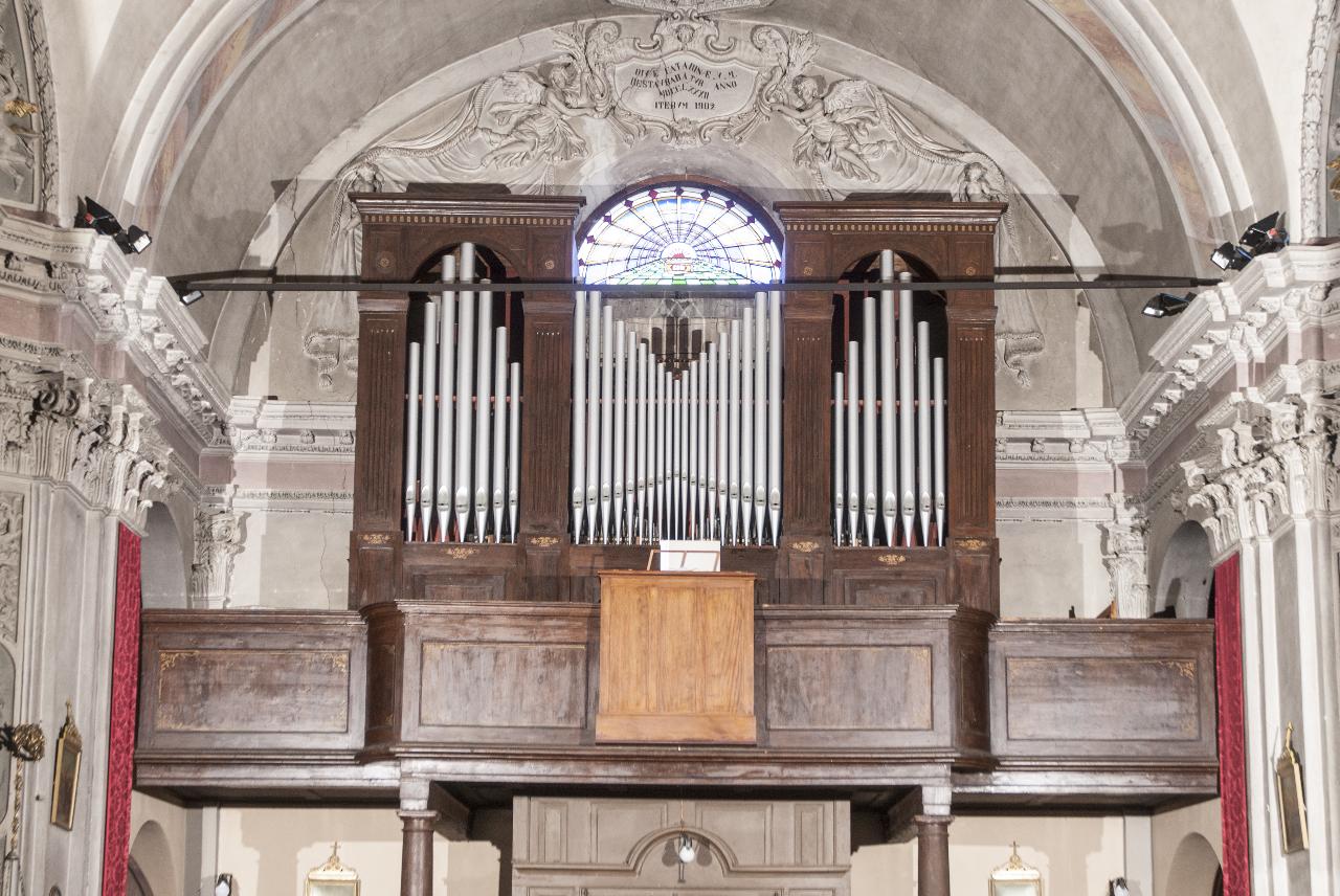 - NOTIZIE STORICO CRITICHE La cassa d'organo della Chiesa di S. Caterina d'Alessandria a Boffetto di Piateda venne realizzata nel 1926, in occasione dell'installazione di uno strumento, costruito da Elia Gandini su contratto stilato con il prevosto don Giuseppe Valmadre, il quale, dopo una fase preparatoria iniziata col suo predecessore, decise di dotare concretamente la Chiesa di un organo. Coordinata alla tribuna, la cassa è costruita in legno d'abete dipinto. Risulta suddivisa in tre corpi, di cui i laterali identici tra loro. La campata centrale si presenta "a giorno" e le canne di facciata vi sono disposte ad ali discendenti verso il centro. Ciascun corpo laterale ha forma di parallelepipedo e le canne in facciata sono disposte a cuspide in una campata terminante ad arco e compresa tra due lesene scanalate. La parte superiore del corpo termina con un profilo modanato, sotto il quale, mediante la pittura, è stata realizzata una cornice a finti dentelli in marrone chiaro. Il medesimo colore si riscontra, come nella tribuna, in alcune decorazioni fitomorfe dipinte che ornano il manufatto.\n\n