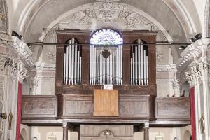 Cassa d'organo in legno d'abete sagomato, modanato e dipinto