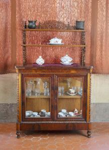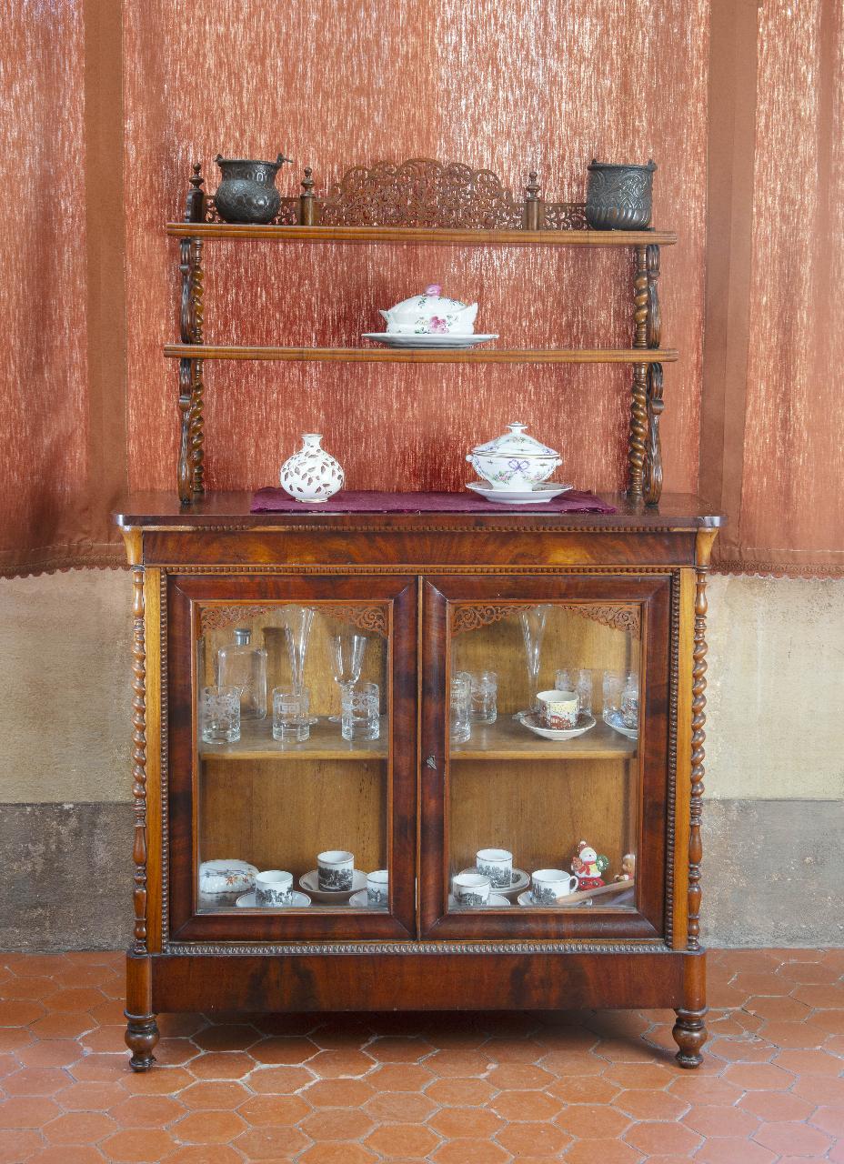 Vetrina espositore in legno massiccio formata da due parti: il corpo inferiore è composto da due ante a vetrina chiuse, parti laterali a vetri fissi, colonne tornite in prossimità degli spigoli anteriori, piedini a cipolla; il corpo superiore a "étagère", presenta due ripiani sostenuti da motivi decorativi a voluta e colonnine tornite, cimasa superiore riccamente intagliata.\n