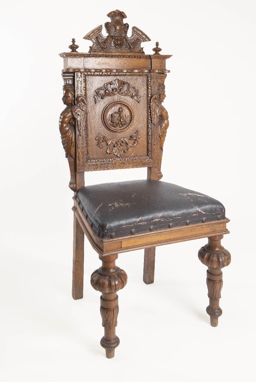Coppia di poltroncine in stile neorinascimento in legno di noce intagliato e scolpito, rivestimento in pelle nera per la seduta.\nSpalliera terminante nella parte superiore con un piccolo frontone spezzato intagliato con inserito al centro un motivo decorativo a cartiglio e mascherone sottostante. Al centro, specchiatura rettangolare con all'interno motivi decorativi vegetali intagliati e scena di genere posta entro un cerchio. La specchiatura è delimitata a destra e a sinistra da figure di cariatidi scolpite ad altorilievo; gambe anteriori tornite e intagliate.