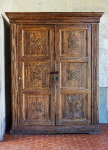 Armadio a due ante frontali, realizzato in legno massello, sorretto da piedi a mensola; le ante sono ornate da specchiature rettangolari modanate con all'interno un motivo decorativo polilobato. Le specchiature sono presenti anche nelle parti laterali; il cappello è sorretto da cornicetta a mensole. Predomina la maestosità della struttura e una raffinata eleganza data da un decoro molto semplice e sobrio.\nAll'interno dell'armadio è presente una tendina in tessuto con la specifica funzione di riparare dalla polvere i vari capi di abbigliamento.
