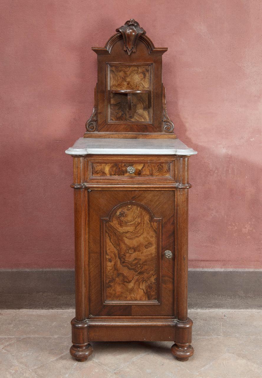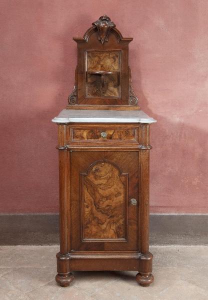 Coppia di comodini dell'epoca umbertina in legno di noce massiccio con inserti in radica di noce. Retti da piedi torniti, presentano sul fronte anta e cassetto impiallacciati con cornicetta, due ripiani interni. Piano modanato in marmo grigio, pomelli in metallo. Alzatina sagomata con ripiano e motivi decorativi vegetali intagliati.