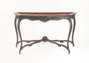 Console in legno intagliato e laccato con piano d'appoggio rivestito in buona parte da velluto rosso. Sorretta da quattro gambe mosse raccordate tra loro da traverse, la console è decorata con intagli a ricciolo ed elementi rocaille, fogliacei e floreali, quest'ultimi posti nella fascia sottopiano.