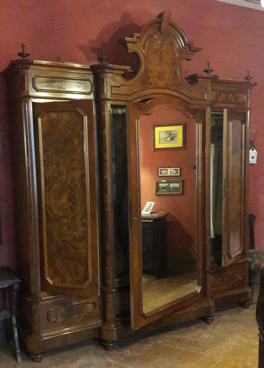 Armadio umbertino retto da piedi torniti, presenta tre ante di cui la centrale con specchio, due cassetti laterali nella parte inferiore. Cornicette modanate e mistilinee ornano i vari componenti. Termina con alta cimasa sagomata e torniture. \nAll'interno dell'armadio sono presenti abiti, cappelli, borsette e biancheria varia: una tendina in tessuto ha la specifica funzione di riparare dalla polvere i vari capi di abbigliamento.