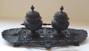 Calamaio in bronzo fuso dotato di due depositi per l'inchiostro di foggia tonda muniti di coperchi, poggianti su un vassoio dalla forma ovale provvisto di manici e piedini. Tutte le superfici sono decorate con motivi decorativi vegetali, a volute e grottesche.