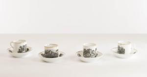 Sevizio da caffè composto da dodici tazze e tredici piattini in porcellana "à litron" decorati a decalcomania con serie di vedute con castelli lungo il fiume e paesaggi di fantasia; profilature dorate. I vari pezzi sono privi di marchio di fabbrica.