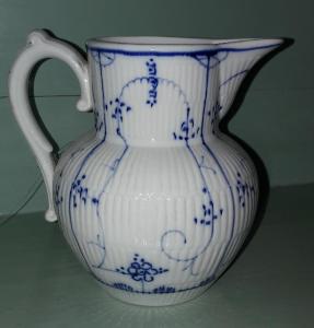 Lattiera con beccuccio, manico ad orecchio con bitorzolo, arricchita da profilature, motivi decorativi vegetali stilizzati e di fantasia in colore blu. Tutta la superficie del corpo della lattiera è caratterizzata da costolature in rilievo disposte su più registri.