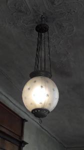 Lampadario a sospensione a una sola luce, composto da una struttura metallica portante in ottone: parte superiore data da catenelle e piattelli che sorreggono la sfera in vetro smerigliato, decorata con motivi ornamentali a stella, incisi e molati a mano. Coronamento inferiore con anello in ottone traforato che ha la funzione di sorreggere il corpo in vetro.