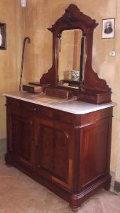 Comò dell'epoca umbertina in legno di noce massiccio con impiallacciatura in mogano. Retto da piedi torniti a cipolla, presenta sul fronte un cassetto e due ante con cornicetta sagomata che nascondono tre grandi cassetti interni. Piano d'appoggio modanato in marmo chiaro su cui poggia l'alzata con specchio molato, due cassettini laterali con cornicetta; profilature, cimasa sagomata con inserto dato da motivi decorativi vegetali intagliati.