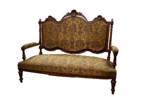 Divano in legno intagliato e modanato, con alto schienale sagomato, gambe a rocchetto, rivestito in tessuto pesante di cotone con motivi floreali (gobelin).\n Il divano è coperto dalla housse su misura in tessuto grezzo beige con ricamate le iniziali in rosso B M (Bottelli Macchi).
