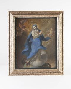 Maria è in piedi su una nuvola; indossa una lunga e avvolgente veste bianca e un ampio mantello blu. Il suo aspetto è di una giovane donna, dal suo capo si espande una luce raggiante dorata. Due gruppi di putti sono presenti in alto: volano intorno alla figura di Maria. Lo sfondo è un cielo ideale invaso da una luce dorata e occupato interamente dalle nubi.\nMaria calpesta un serpente: rappresenta la sua vittoria sul diavolo.\nContrasti tra luci e ombre, tra tonalità calde e fredde di colore.\nOpera entro cornice in legno modanato e dipinto.