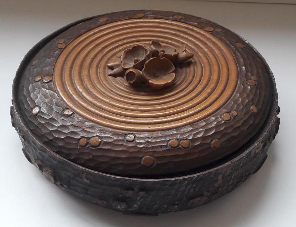 Semplice scatola in legno di forma circolare con coperchio, presa data da un bouquet di fiori intagliati.