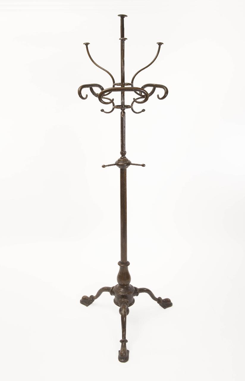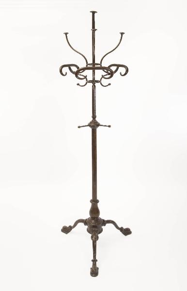 Attaccapanni ad asta in ferro dipinto ad imitazione del legno; base a treppiede su cui si innesta l'asta munita nella parte centrale da elementi sporgenti per appendere gli ombrelli, nella parte superiore ganci e riccioli per cappotti e indumenti in generale, bracci ricurvi per cappelli.\nLa flessuosità dei vari componenti dà forma ad una elegante struttura.