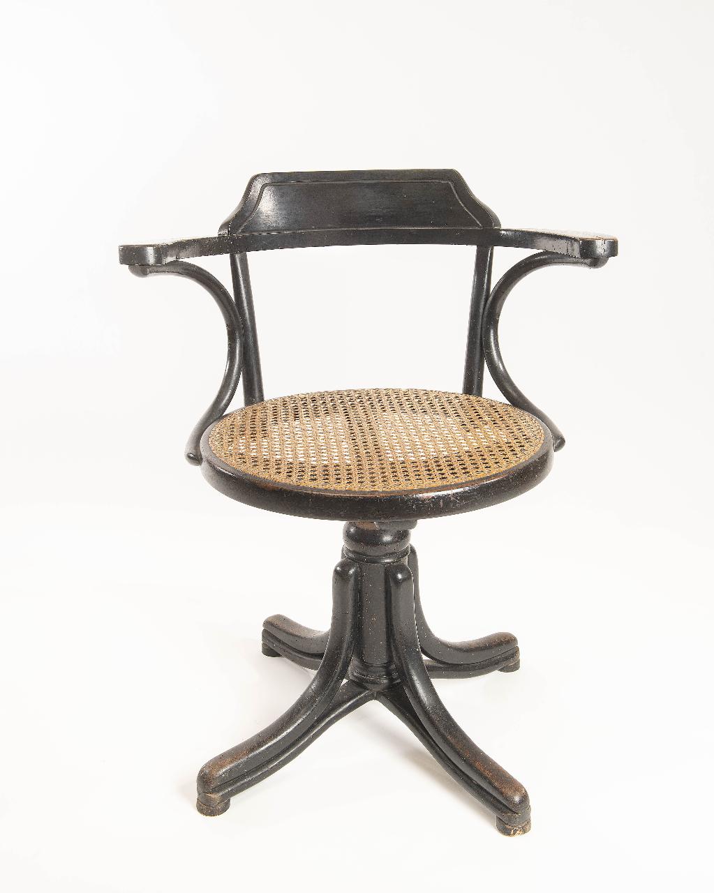 - NOTIZIE STORICO CRITICHE Il manufatto è stato prodotto dalla manifattura Thonet; come gusto d'arredo riprende altri manufatti Thonet presenti in altre stanze della casa.\n\nLegno di faggio: si tratta di un legno semiduro che, purtroppo, si tarla facilmente, quindi viene considerato povero. Per le sue tonalità chiare ma variegate, dal biondo al rossiccio, fu comunque apprezzato dagli ebanisti francesi. Venne impiegato soprattutto per le strutture dei mobili o, in alternativa al noce, da parte dei mobilieri inglesi di provincia per opere popolari, più che altro nel '700. L'utilizzo più nobile lo si deve a Thonet, che applicò la piegatura a vapore del faggio nella realizzazione dei mobili, in particolare per le sedie che presero il suo nome.