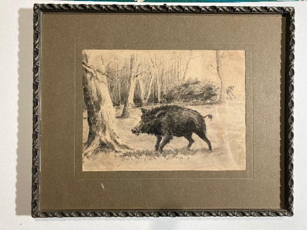 Disegno tracciato a china con parti acquerellate su carta, montato su cartone, in cornice con finestra passepartout al recto.\nRaffigura un cinghiale in primo piano che cammina all'interno di un bosco. Contrasti chiaroscurali che definiscono i volumi dei vari elementi della rappresentazione; resa naturale delle setole che compongono il manto del cinghiale attraverso tocchi di colore e pennellate veloci. \nLa semplice cornice è in legno modanato con tracce di argentatura.