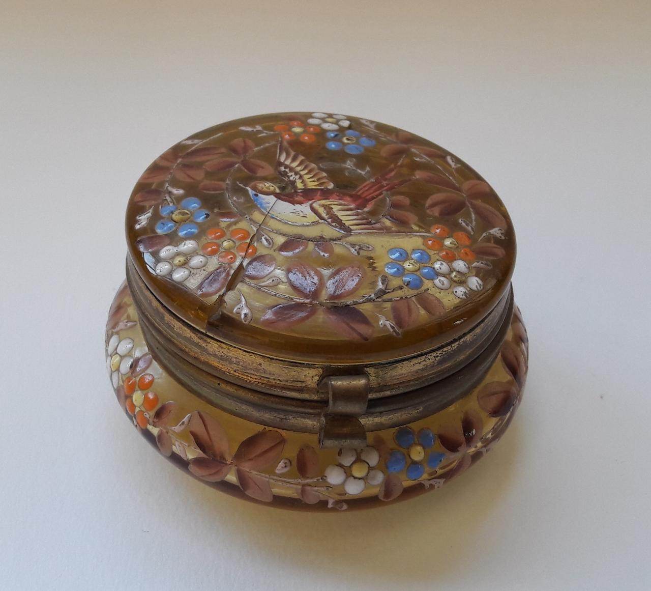 Piccola scatola tonda con coperchio, cerniera e montatura in ottone. L'intera superficie in vetro è dipinta a mano con motivi decorativi floreali e un uccello ad ali spiegate sul coperchio.