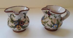 Coppia di brocche in miniatura in ceramica dipinte a mano con motivi decorativi floreali e vegetali, filettature dipinte in color marrone.