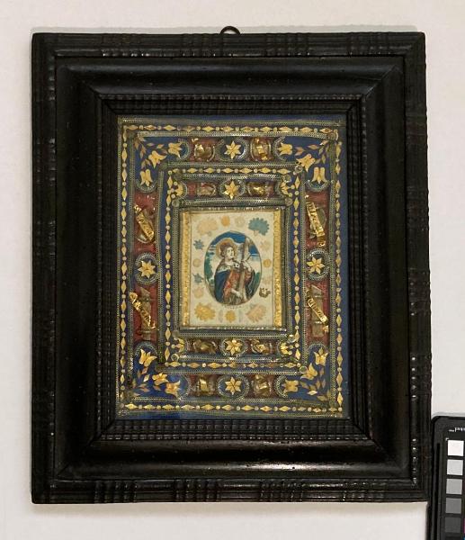 Reliquiario inserito in cornice in legno modanato, intagliato e laccato di nero. \nNella parte centrale, immagine votiva in carta raffigurante Sant'Elena; tutt'attorno sono presenti reliquie di vari santi. Lo spazio risulta suddiviso da eleganti cornicette in metallo e in carta ritagliata con elementi decorativi dorati.