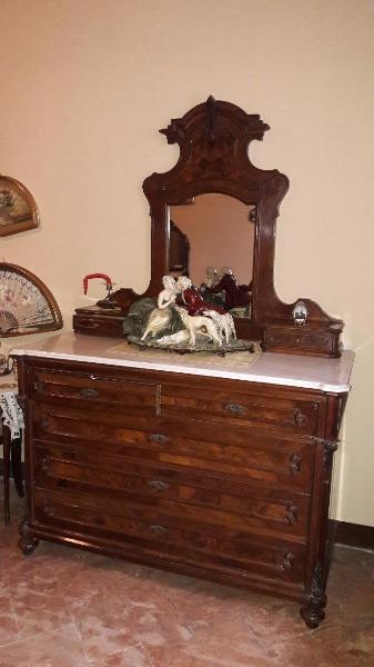 Comò dell'epoca umbertina in legno di noce massiccio con impiallacciatura in radica di noce. Retto da piedi torniti a cipolla, presenta sul fronte serie di cassetti decorati da cornicette mistilinee. Montanti arricchiti da motivi decorativi vegetali a intaglio. Piano d'appoggio modanato in marmo bianco su cui poggia l'alzata con specchio, due cassettini laterali con cornicetta; profilature, cimasa sagomata sottolineata da cornici aggettanti.