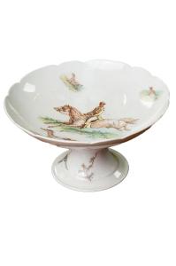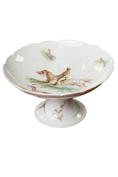 Coppia di alzatine in porcellana bianca decorate sul piano di appoggio e sullo stelo con figure di cacciatori e animali entro essenziali ambientazioni, realizzati con la tecnica della decalcomania ritoccata a mano. I manufatti sono privi di marchi di fabbrica.