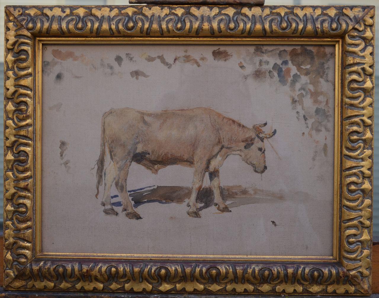 Dipinto realizzato ad olio su tela, appoggiato su cartoncino di chiusura del tergo. Raffigura al centro un vitello preso di profilo rivolto verso destra; contrasti tra luci e ombre, traspare la naturalezza del soggetto rappresentato reso attraverso una accurata esecuzione dei vari dettagli. \nL'opera è all'interno di una cornice in legno modanato e dorato.