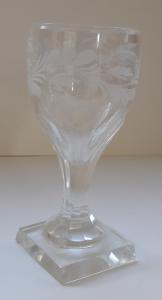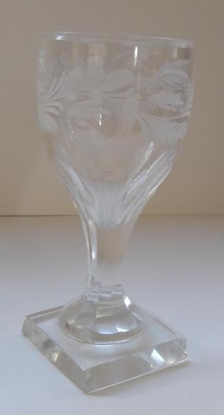 Bicchiere da liquore in cristallo molato con sfaccettature lungo la superficie, base quadrata, ornato con motivi decorativi vegetali.